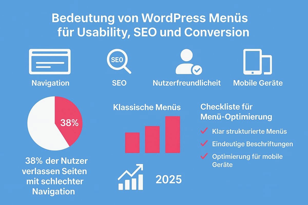 Menüs prägen die Struktur und Bedienbarkeit einer Website. Ein gut durchdachtes Navigationskonzept sorgt dafür, dass Besucher gewünschte Inhalte schnell erreichen. Dies steigert die Verweildauer und senkt die Absprungrate. Auch Suchmaschinen bewerten eine klare Menüstruktur positiv. Studien zeigen, dass 38% der Nutzer eine Seite verlassen, wenn die Navigation unklar ist. WordPress Menus bieten hier entscheidende Vorteile, indem sie interne Verlinkungen und eine logische Seitenhierarchie ermöglichen. Mehr dazu finden Sie im Beitrag zu WordPress SEO Optimierung.